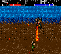 Anyway, the next section's your first taste of moving in water. It's much the same as walking on terra firma, but you're a lot slower, and you can dive underwater for a brief moment to avoid bullets and explosions by pressing Jump- just don't walk into enemies when submerged, as it'll still hurt, . If you forgot to grab the fins earlier, your underwater speed's the same as above the water, so it's not very useful. With the fins, underwater movement is a lot faster, so I hope you didn't forget to pick them up. The enemy appears in sizeable numbers here, including machine gun guys, so be careful, especially at the end of the horizontal section- if you're close to the top of the screen when it ends, the screen will snap upwards for the next vertical section, bringing a load of enemies on-screen! You don't want that to happen, especially since there's machine gun guys amongst them, so watch out for that.