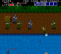 Once you start moving vertically again, the river gives way to a small grassy area- you'll still move slower in the grass, but you can jump freely now. This would be a fairly tough area, seeing as it's got a few more machine gun soldiers... But just before you enter it, there's a crate with a Shotgun in it, which makes short work of anything the enemy throws at you. Once you reach the end...