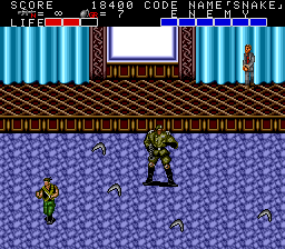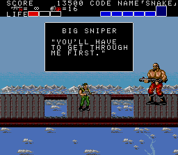 As you just saw, your gun's been trashed by the enemy commander's boomerang- yes, that is something I just typed out- so this is one of a few sections in the game where you're down to just your knife. Apparently the commander stole your secondary weapons too, so no Grenades (or the Flamethrower if you still had one from the previous stage) either- this battle relies purely on your knife skills. As a fairly unsporting chap, the commander uses his highly advanced weaponry on you while you're unarmed- he starts with a spread of five boomerangs that move slowly but will make their way over to you eventually, then after two of those, he'll start firing his cannon, aiming for you while it charges up, then hopping to another part of the screen and firing again. Like the Big Sniper, this one has an audio cue (the same one, actually) but it's a lot faster, so you've got less time to react. After a few shots, he'll go back to his boomerang and repeat until he's dead. Or you're dead. Whichever.