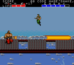 Even with a health top-up, though, the next section can be tough- it's a narrow bridge that's been poorly maintained as it's got lots of holes in it. You slip up, it's instant death. As well as enemies walking in from the right, paratroopers will swoop in from the top of the screen, and while they' can't hurt you until they land, they can still be distracting and make you fall off out of panic. Your best bet here is to inch across the bridge, taking out any enemies on screen before jumping over gaps- you really don't want to die here, as losing the Flamethrower makes the boss a bit harder.