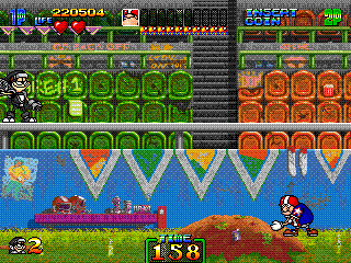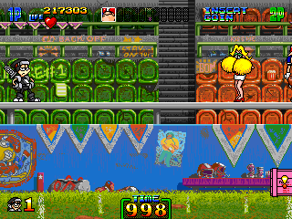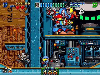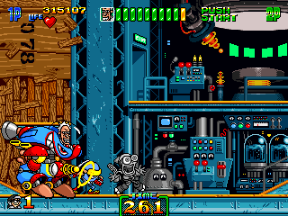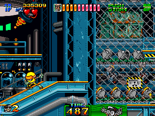 So, naturally, Stage 5 takes place in a typical mad scientist's lair. You know the type. Lots of conveyor belts both in the background and the foreground, various science-type flunkies armed with rayguns, lazor beems mounted to the ceiling, and, for some reason, the generic ninja enemies back from Stage 3. It's pretty standard stuff, ripping pages directly from the 'Scientist's Lab' page of the Generic Platformer Guidebook. However, one of the enemies is not one you'd particularly expect to find in a mad scientist's laboratory...