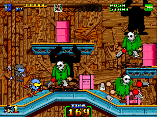 A joke for the video game crowd, then. In this tiny segment of the lab, these hockey mask-wearin', chainsaw-weildin' maniacs launch themselves from the acid vats, exactly like the Pobodoes/fireballs from the Castle levels in the original Super Mario Bros. Now that is an inventive use for a (near) indestructible murderer if ever I've seen one, and one of the craziest things in the entire game. Utter genius. Makes one wonder what the hell Dr. Mac is even up to down here... Speaking of, he's our next boss. Time for an appointment with the Doc.