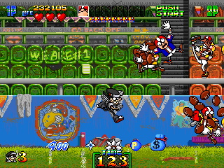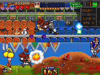 After that, the level proceeds to get a little crazy with the rampant fires and the giant mace balls. Keep in mind that this is supposed to be a football field, not a death trap. People are supposed to play and watch the wonderful past-time of American football here, not get horribly skewered by random spikes and set ablaze but then again, what do I know? Anyway, the game perks up from the slump in Freddie's stage and kicks things back into 'Hectic' as there's lots of danger, in particular the mini football players who litter the stage with football bombs, the cheerleaders flinging kisses of death your way, and the rest. I'm not going to tell you to take it slowly here, because that'll give the enemies ample time to run on screen. Just dash through and you should be alright.