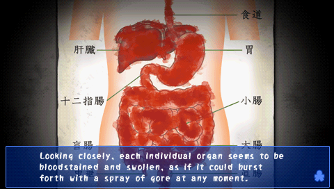 So... If there's no battles to be fought, how do you die? This wouldn't be a horror game if bad things didn't happen to good people, and this is where the Wrong Ends come in- examine the wrong notes, wander into the wrong rooms or make other mistakes, and someone will die, usually painfully, usually with detailed text accompanying their demise. Game Over, back to the last save point. Fortunately, for the most part it's fairly obvious what actions will see one of your characters off, as the game does provide hints from time to time, and the save points are nicely spaced out so if you do trigger a Wrong End, it shouldn't take long to rectify it. There are a few red herrings that will get you stuck (including a cruel one in the first chapter where you have to directly disobey a clue the game gives you!) but for the most part, the game plays fair... This does not, however, apply to the final chapter of the game, which has the most Wrong Ends and, unlike the previous chapters which are pretty specific in how you can mess up, just looking down the wrong hallway or examining one item will get you killed, there's little in the way of clues, and you can screw up badly enough to have to restart. This is especially frustrating as Chapter 5 has the longest cut-scenes in the game, which leads me neatly into the next problem- you cannot skip any dialogue, even if you've seen it before. If you happen to screw up before a gauntlet of cut-scenes, then you'd better hope the X button on your PSP is still working. You will have a lot (a lot) of exposition to click through, which can get mind-numbing. A 'skip cutscene' button would've helped.