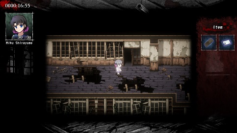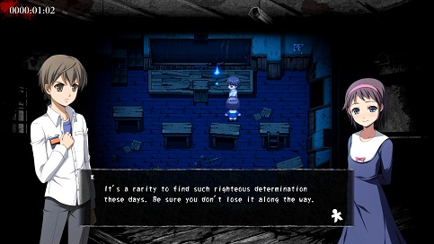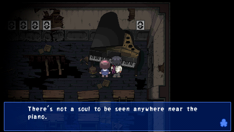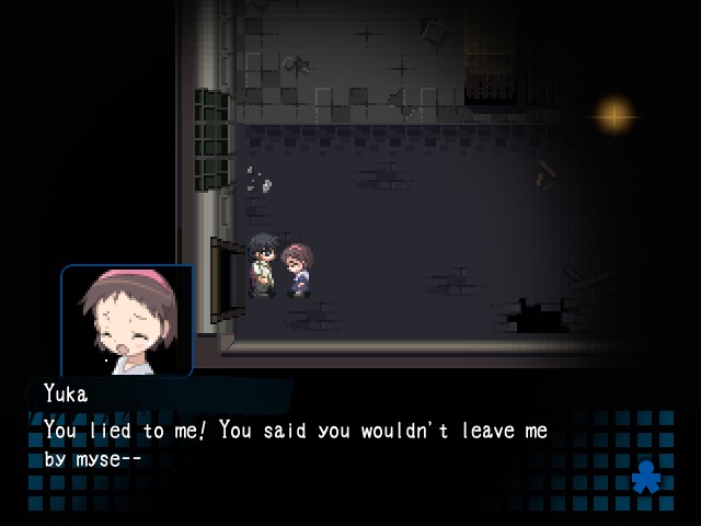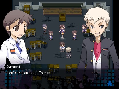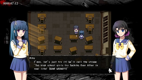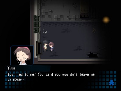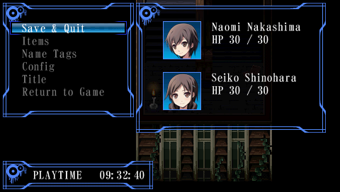 There's a little bit of the spirit of Clock Tower in this one- the general idea, the multiple ways to die and the game tracking your progress with the bad endings- but instead of being a horror-themed point-and-click adventure, Corpse Party is, as I said, more like a 16-bit RPG with healthy dollopings of visual novel elements thrown in. Rather than fight battles and level up, your character (which constantly changes to the whims of the story) wanders the halls of Heavenly Host Elementary, picking up items, examining notes/corpses for clues, making decisions at certain points, and triggering cut-scenes to move the story along. The school isn't actually that big, and you'll see the same halls quite a few times, but as each set of characters initially occupy alternate versions of the same place, different paths are available in different schools (changed further by the constant earthquakes). The only other quirks are the student IDs found on corpses (gotta catch 'em all- they detail how the victim died) and certain 'chase' sequences where you're pursued by an enemy (nowhere to hide like in Clock Tower- just evade until you advance the story) with bad things happening if you're caught. That's pretty much all there is to it, the game is about 70% text, 30% adventurin', and there's no gameplay mechanics beyond that (although amusingly each character has a HP count on the status screen, only used in two specific parts of the game). There isn't much to moan about here- the mechanics do the job, and paying attention to what you're told (you might want a notepad for this one) should get you through pretty easily. The only complaint here is that the chase sequences can feel a little clumsy (I can see people getting stuck on the first one, but they're not that common) and certain items- loose planks in particular- are very easily missed, which can leave you stuck. (That said, the plank is a lot easier to see if you're playing on a PS Vita, which really does wonders for Corpse Party's presentation).