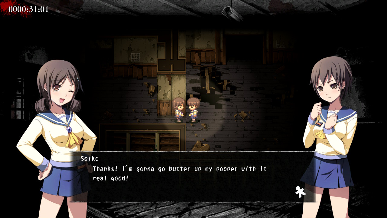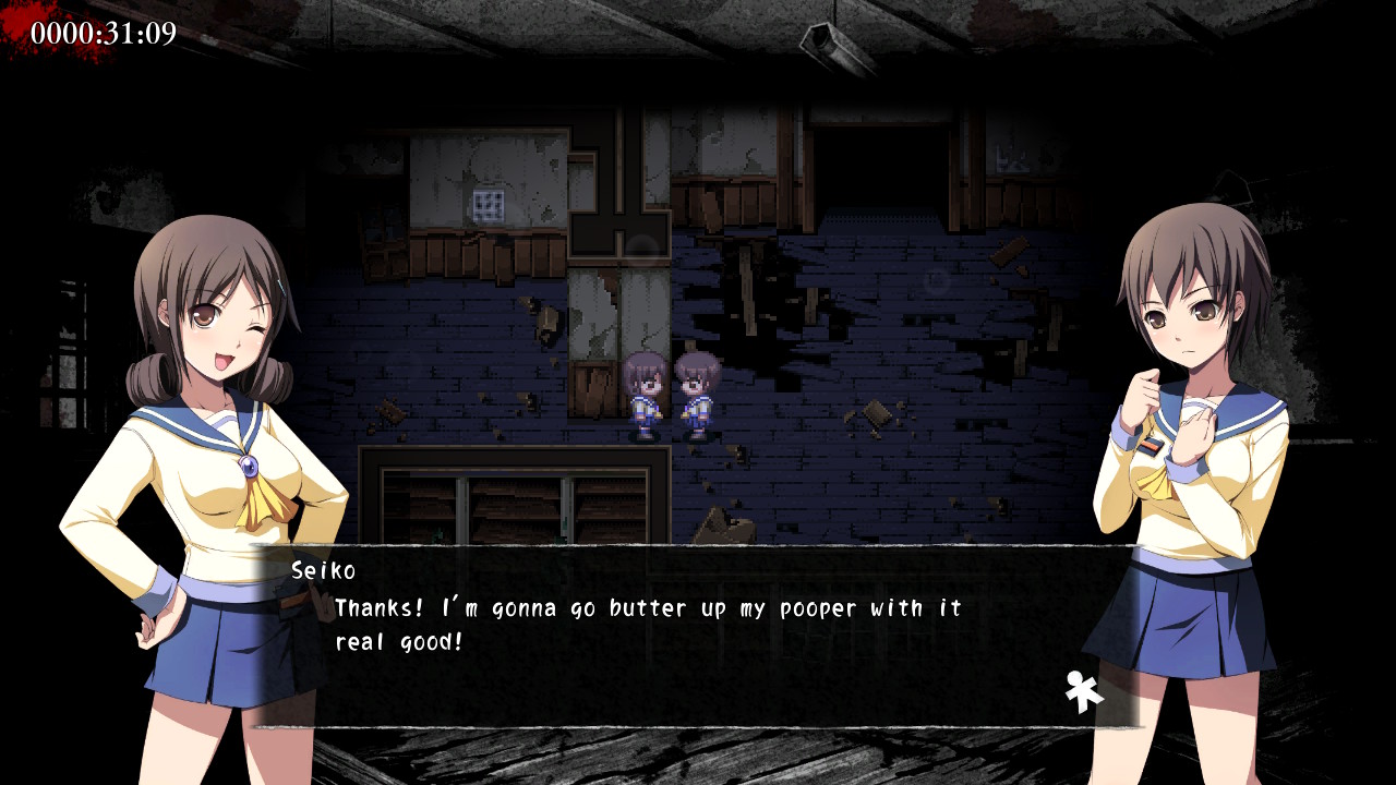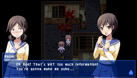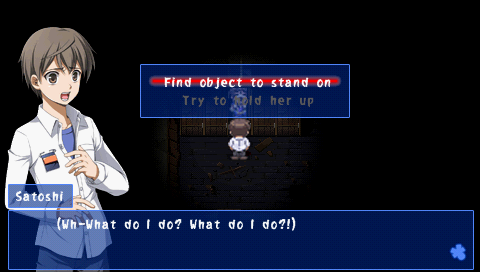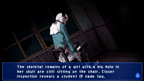 OK, so, this reviews' based on the PSP version of the game which, if you've read our group page for the Corpse Party series, you'll know is an enhanced port of the Windows version, which in turn was based on the mobile phone remake of the original PC-98 Corpse Party. What I'm getting at here is there's a lot of versions of Corpse Party, and it's the PSP one we're talking about today. Except for the bit at the end where we talk about the Windows version that's on Steam too. Also, we used to have nicked screenshots from all over the 'net on this page, but they've all been replaced with our very own screenshots now. They're mostly the same as before except the ones that aren't. These look better anyway. They're more authentic, I guess. We still didn't put a shot of the 'butter up my pooper' line here though, you're best finding that elsewhere.