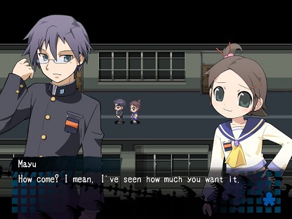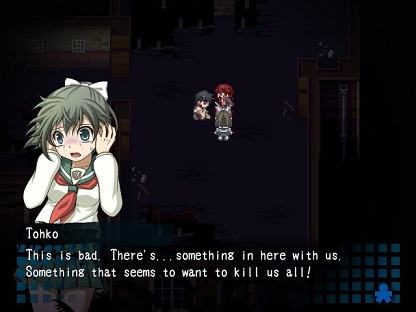As the most story-driven game covered on this site, this is where we'll be focusing our attention. For the most part, the story works pretty well- it keeps the mystery going for most of the game, and it really utilises its characters well, as through its dialogue and flashbacks you get surprisingly attached to your little band of schoolmates. The game even has ten short unlockable 'extra' chapters devoted to fleshing these characters out. Sure, they're mostly stock characters- the 'main' guy, the timid one, the hyperactive one- but the game mostly builds on the fact that you get to know about them and exploits it to great effect. Unlike a lot of horror games out there, the focus isn't on jump scares or gallons of blood, you see. You do get that, but even before the characters themselves start getting messed around, the game tries to psyche you out in a few ways, like having your characters stutter while they walk, the flavour text on items and notes becoming increasingly depressing/deranged as the story advances ('Admit it. You hate all your friends. Eventually, you'll kill one another' is a good one) and dimming the lights for no real reason. The game also makes great use of sound- the game is fully voiced in Japanese (and because of this game I now know every possible way of screaming, crying and shouting 'ONII-CHAN~') which makes the death scenes more real, the sound effects are grisly and designed to make you uncomfortable (lots of squelching and wretching) and the music is an odd mix of chiptunes and (mostly) horror movie-esque tracks, which works well.