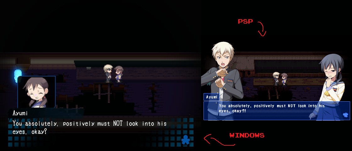 Anyway, if you liked the PSP game, it may be worth grabbing the Windows port to compare and contrast the graphics, and for that additional chapter. And hey, if you haven't played it in a good while, you'll get a kick out of it, although I imagine this is one for the big fans only. If you want a PC version of the PSP game though, you'd have to wait a little longer, we'll get to that. We'll end with a comparison screenshot- notice that the PSP version's sprites are a little blurrier, so that might be another incentive to get this version.