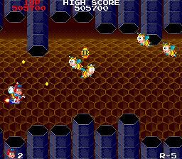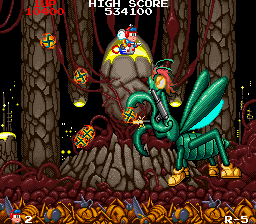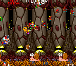 ... For this fresh hell! A fairly intense section in both games, this is doubly so in the Mega Drive game, due to the incredibly annoying Middle Boss bug that appears- it launches what I think are basketballs at you in a bullet pattern that's very difficult to avoid- there's literally pixels in it, and fluffing up even slightly results in death. The Middle Boss in the arcade version is much more lenient, and isn't even in this section- it does a 5-bullet spread too, but all in a line, so it's a lot less confusing. There's still a lot of enemies to fight, mind you, but you should be used to this by now.