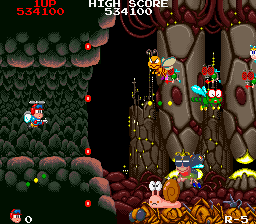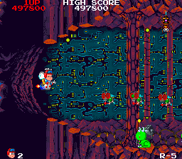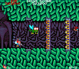 Here, the two games start to match up a little better... Both games have a spike segment, with the Mega Drive one being more intricate and maze-like, seeing you weave through the spikes. Whoever coded the Mega Drive version really had a hard-on for puzzley-type bits in their shooters, they're all over the place here, whereas the arcade is more focused on the shooting of bad guys. Kait's huge size makes getting through the spikes pretty dicey, though. The colony of frogs living here doesn't help. Yanmer has a much easier time of it, with only 2 spiked walls getting in his way. Little Yanmer gets all the perks, while Kait has to work his ass off. No justice, eh?