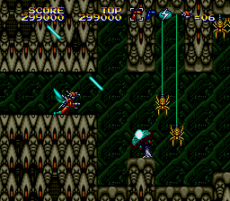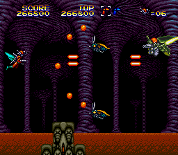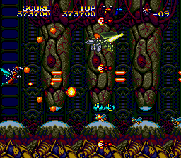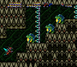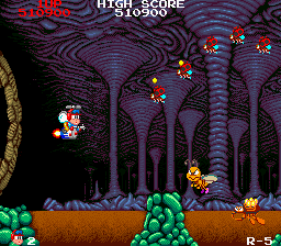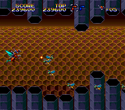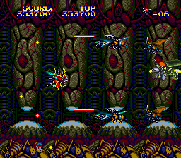 Ah, so here's the proper start to the level, and this is where the Mega Drive version of this level begins. I suppose it's fitting that the majority of the enemies in this segment are Bees, or at least resemble them vaguely (Mega Drive, I'm lookin' at you) as we are, very clearly, in a beehive. Funnily enough, I don't remember the Laser Bee Death Squad appearing in this little segment, as they're later in the level... There's also an 'open air' segment in the hive, similar to the place in Stage 2 where the strange looking insects rise up to try and ram you. There's little to say, though, as this bit is over pretty quickly, to make way...