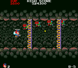 Once again, the Mega Drive version goes rogue here- the arcade game carries on with a short section involving spikes, whereas the Mega Drive one starts a new segment in some caves, seeing the return of the Improbable Orb That Does Nothing and, of course, those Bloody Annoying Mushroom Things. And more Spiders. This bit isn't really that difficult, though, although the spikes in the arcade game are accompanied by Those Damn Flying Things... I think they're dragonflies. I don't know. I hate them too much to care about what they are. So yeah, this section? Piece of cake.