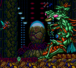 Just like the Stage 2 boss, though, the final boss in the Mega Drive version is a wuss. All it does is sit there and launch arched projectiles at you, which are incredibly easy to dodge. His weak point is his stomach, and the arms of the creature lift up every now and then to expose it. Sometimes, however, it charges a laser beam when it opens which will, rather obviously, kill you. If you can't tell when it's charging to fire said beam, however, you'd better test your eyes because you are clearly as blind as a bat.