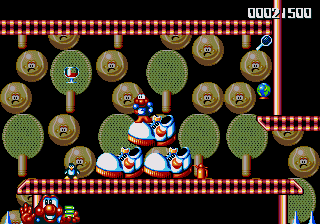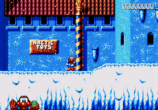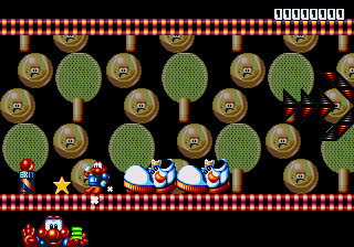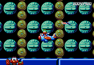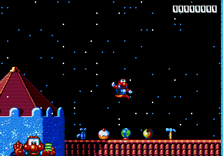 Collecting them in this order grants Pond invulnerability for an extended period (not the rest of the game, though- it wears off eventually) and also unlocks every door... But only after you beat the first world. That's why the easy exit to the left is there- once you activate CHEAT, then you can duck out the first world and play any level you like. This 'spell shit out' thing also applies to three sets of items in the first level- you can spell out POWER (Penguin, Oil Can, Wine, Earth, Racquet) for a quick health boost, and LIVES (Lips, Ice Cream, Violin, Earth, Snowman) for infinite lives. There's also another set of items to spell out CHEAT with in case you missed it outside.