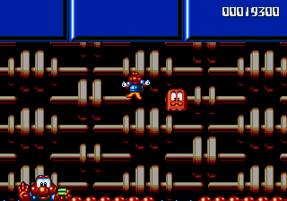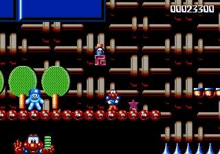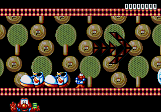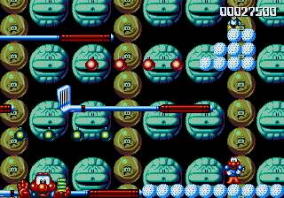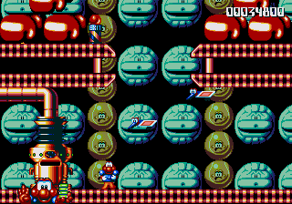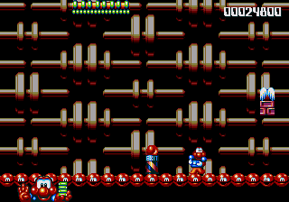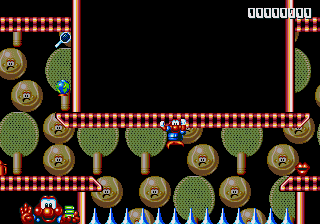 The first world is very, very short, and the three levels therein won't be any hassle to anyone who's ever played a platform game before. The very first stage of the game serves as a way of making sure that you get down this whole 'extending body' lark from the off- as you can no doubt see in the screenshot to the left, there's a big spike pit that can't be jumped over... And a roof above it. Put two and two together, and extend Pond so he'll grab the roof, inch your way over to the other side, and you're across. See, this ability has its uses! It's a real shame that it isn't really exploited enough, but it's used here and there. Anyway, let's press on.
