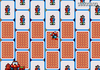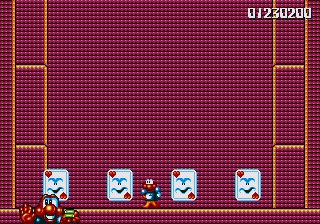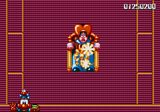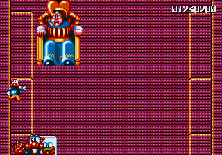I'll be up-front with you- this boss battle isn't very memorable at all. In fact, before I replayed the game to get these screenshots, I'd totally forgotten it was even in here, and I'd done a test run of the game on the original cart just to make sure it was worth covering only a few weeks before. The daft boss name I'm going to pull out of my ass this time shall be Emmaretta the Unspeakable, and her attack pattern is really, really easy. She throws cards at you while moving across the screen like a Space Invader, and... That's it. The platforms to the left and right of the arena let you get high enough to dive-bomb her with ease, so just avoid her cards and stomp her to death.