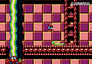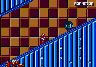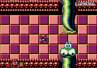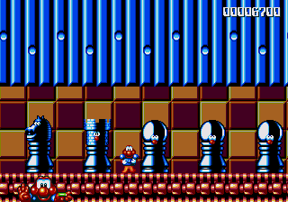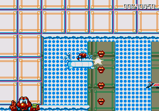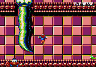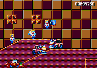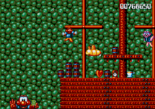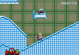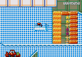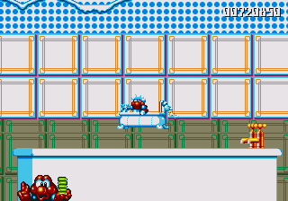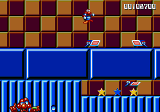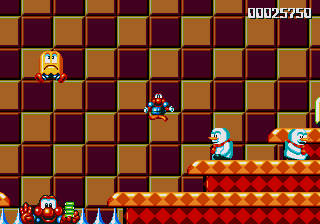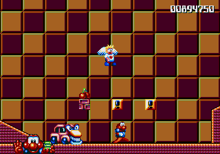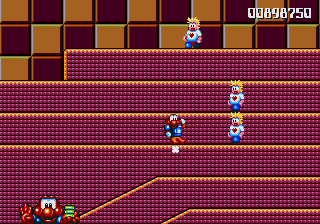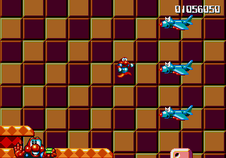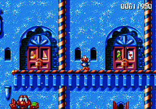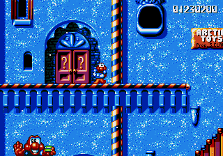 Well, it's a bit of a slow starter, that's for sure. The first stage in this world is pretty boring, and it's only noteworthy because of the fact that the enemies really step up their game- they're baying for Pond's blood from the off, and the lethal combination of Mad Cars and Icarus Kids will really put the hurt on you. Although, while we're here, what's the deal with the Icarus Kid anyway? He's not a monster, nor is he some kind of anthropomorphic vehicle/toy/instrument, so why is he attacking Pond? Are they trying to steal Santa's toys for themselves? Is this plot of Dr. Maybe simply a front for a kidnapping operation? Or are the kids in on the whole thing?!