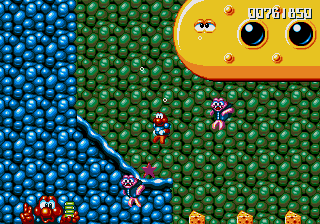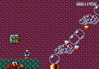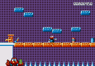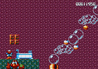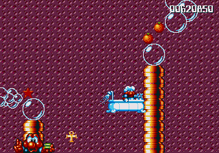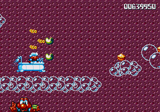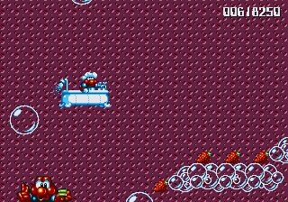 And now for my notes on how this conveyance affects the game. The MAGICAL FLYING BATHTUB is basically a different-looking version of the plane, and controls in the same way- hold Jump to ascend, hold Down to descend (duh), and has the same vulnerability- if Pond himself (sporting a very dashing shower cap) gets hit, then you're tossed out, but this rarely happens because there's a real lack of enemies in these stages, and Pond is a much smaller target when he's chillin' in the 'tub. In fact, he's such a small target that you have to try to get hit, which essentially renders you nigh-on invincible while you're flying around in the 'tub.