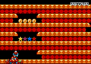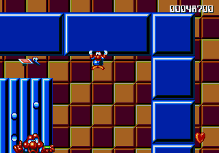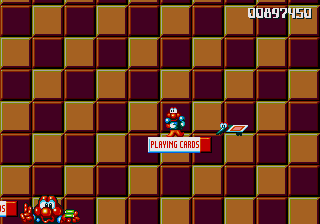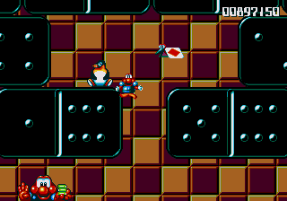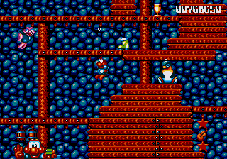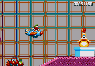 Anyway, the next level is a bit more along the theme of board games, with Pond making his way across giant dominoes and playing cards (complete with an absurd amount of Joker cards) and, of course, the stage is rife with Paper Card Birds. This means that this stage is one of the few where the enemy choices are actually appropriate, rather than completely random, silly things. Anyway, there isn't much to say about this stage, except that the penguins are in some pretty awkward hidey-holes- they're just a smidgen too high to jump into, so you have to stretch to get at them... And, of course, the Paper Card Birds are out on full force, which makes it really irritating to rescue the penguins because they keep getting in the way.