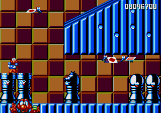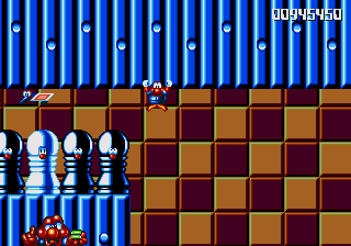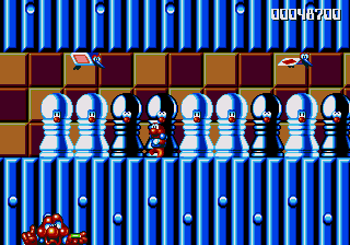 The next stage, however, kicks the Paper Card Bird carnage into overdrive. It's another vertically scrolling stage, with a somewhat out-of-place chess/draughts motif going on, with giant smiling chess pieces serving as platforms, and giant rolling draughts pieces serving as enemies. Pond has to navigate a series of steep hills, but they're not the problem here. Oh no. The real problem...
