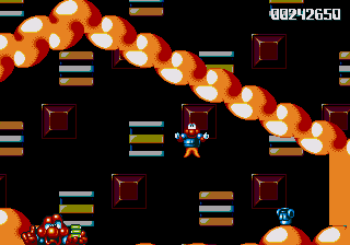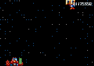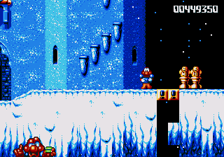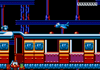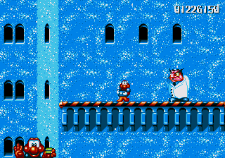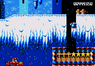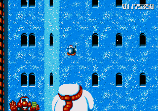Dr. Maybe's final line of defence against Pond is a gigantic snowman thing that he's controlling from the inside, and he's not playing fair. The only boss aside from Chinchin and Cheechee to put up a real fight, the Maybe Snowman Robot seems impossible to kill at first- it's difficult to get onto the platform it's walking along, you're constantly pestered by smaller snowmen, and even if you do manage to get near it, you won't be able to hurt it. Instead, you'll have to bide your time until his head pops off and starts bouncin' around- jump on it and attack the body while the head's gone. If you're really awesome, then you can bounce off the head, tuck into your Expandosuit, nail the body, and hit the ground on the other side of the screen. However, every time you hit the robot, it'll spew out more small snowmen for you to deal with, so kill them, and repeat as necessary.