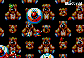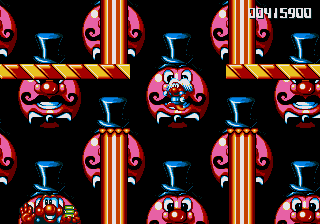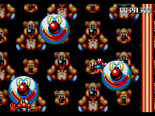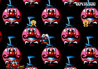 Now, the odd thing about the Circus World (aside from the fact that the scary face from the Fluffy Toy World is back) is the fact that, well, it's piss-easy. You'd think, being the final world in the game and all that, it'd put up a fight, and playing through the stage normally seems to confirm this suspicion- lots of Icarus Kids and peanut-spitting elephants trying to kill you. However, at the start of this stage, you can hop onto the roof of the first circus tent, then make your way into the clouds- there's a Wing item stashed away in one of the bigger clouds, and it robs the stage of any challenge it may have once had. Just fly all the way to the right, then fight your way through some Icarus Kids to get to the Exit Pole, and the job's done.