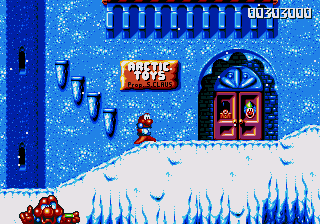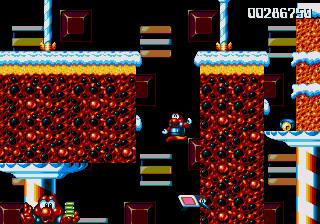 Both stages have floors constructed entirely of orange jelly, and if you jump on it, you'll bounce around as if the entire stage consists of trampolines. The more you bounce around, the higher and faster you'll get around, to the point where if you tuck into your Expandosuit and hold down the jump button, you'll zip across the stage like a near-indestructible pinball, wreaking havoc on any enemies dumb enough to get in your way. Needless to say, this is very, very entertaining, and it's so disappointing that you don't get to fool around with it for very long! The second of these jelly stages makes things even more ridiculous by turning things upside-down for absolutely no reason, which serves to make matters even dafter.