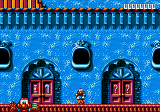 Jump on the golden snowmen statues to the right, and the ! blocks move upwards for you, letting you get at this final stockpile of lives, health stars, and an obscene amount of crown items that skyrockets your score. Needless to say, this opens up after the final world to give you a fighting chance against Dr. Maybe, and it's a damn sight more useful than the hidden worlds. If, like me, you had your fishy little ass whomped by Chinchin and Cheechee, costing you several lives and a continue, then this is really useful.