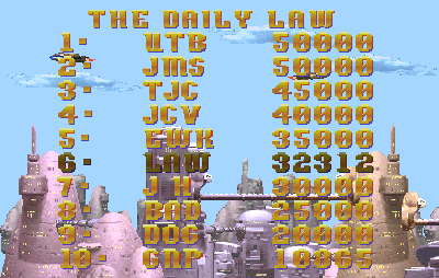 As a nice touch, you get to shoot the letters for your name, Dredd-style. So let's give it up for HIGH SCORE TABLE TIME!!!