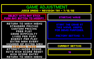 The Test Menu (if you're following at home on MAME, press F2 at any point in the game) is a very handy thing for arcade operators, but most of the time it's a bit useless for players- often, it's all about the pricing of the game, and in American games especially, there's a bazillion different pricing options, designed to rake out as many quarters out of people as possible. Judge Dredd is no different, but you can also set the starting level (referred to as 'wave', like in a lot of Midway titles) and it goes all the way up to 27! Unfortunately, if you're expecting a load of missing levels from here, you'll be disappointed, there's only one. Since the numbers don't logically match up, here's where each one takes you.