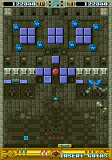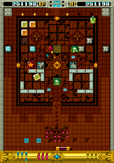 The basic mechanics are mostly standard for this kind of game, but as mentioned, there's no spinner controls in this dumped version so we've just got a stick and two buttons to work with. OOParts does a lot with a little though, as we'll see. The first button speeds up your paddle but also lets you slam into the walls on either side of the arena, startling some enemies and, more importantly, altering your ball's trajectory. This is a huge boon as if you've ever played this kind of game before, you've inevitably found yourself in a position where you have one target left that you can't quite hit because you keep getting the angles wrong and you just want the stage to end. Not as big a problem here, slam into the wall and you'll slightly adjust your ball's angle in mid-air, usually in your favour- if you got a real shallow angle after bouncing it from your bat, adjusting the angle sends it back down so you can try again quickly, and if it's further up the board, a quick slam angles it a little higher. This is a really clever way of trying to tackle one of the big things you can get wrong in this genre (looking at you, Block Gal) although I don't like that if you use this very useful mechanic too often, you'll break through the wall. You'll be able to pass through to the other side which can be handy, but losing that angle-adjusting mechanic is rough, you really feel its absence. It does take a lot of hits to destroy it to be fair, but still, I'm not keen on having it taken away when it's so fun to utilise.