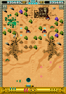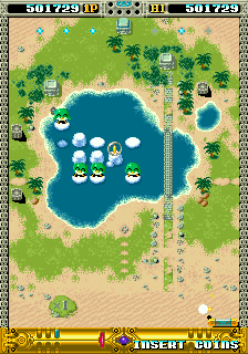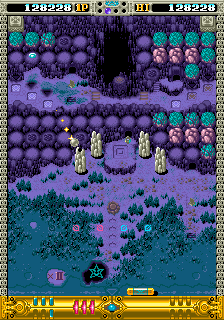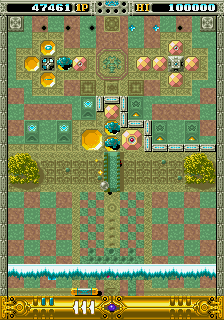 The structure's a little different from the norm in this genre, though. At the start of a fresh credit, you get to pick one of six worlds of two areas each, then move on in a little mini-game that picks your next destination, with a final two-area challenge waiting for you at the end of the game. Already this is a big difference from other games in the genre- these are usually long for arcade games similar to single-screen platformers, you'd be looking at over 30 stages but not so here, there's only 14 stages per playthrough. Honestly, I think this is in the game's favour though, and actually encourages repeat plays because while the first area of the six main worlds is the same, the second area can be one of three completely different designs so it's never quite the same run twice. The requirements for which area you get sent to are the one thing I wasn't quite able to figure out but it does seem tied to the amount of time you spend on an area (and the game even has a day-night cycle exclusively for those opening areas) but whatever the method, you won't see all stages on a single run, and there's a lot of variety visually between all these stages, so it never feels like a slog. I know I was happy to play through a few times to see as many of the different areas as I could!