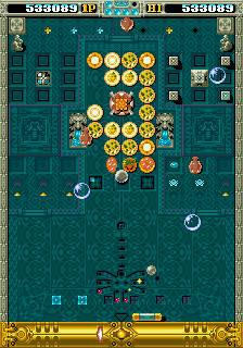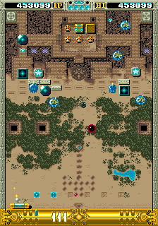 A variety of stages is nice, but you've got to have stage designs to go with them, and here OOParts calls back somewhat to much older Breakout-style games like Namco's Cutie Q in that it adds a lot of pinball elements for variety, but I think it does it in a pretty interesting way. Every area has a specific type of block that needs destroying to satisfying the stage clear requirements (these are the ones that monsters you can take out with your ball) but there's several extra parts they all have in common- permanent light targets that spawn item eggs (that keep track of how many times you've lit them all- fill the meters for an extra life!), a multiplier that builds up by destroying drop targets in each world's first area or destroying enemies in each world's second area, and light targets that flit between red, blue, red then off that give you a barrier if you can land the ball in the magic jewel if you get all reds or take you to the Oasis bonus stage (on the first stage of each area) or the Trap punishment zone (on the second stage of each area, shown in LordBBH's playthrough at 5:07:23- if you end up here, you must replay the stage you came from!) if you get all blues. Quite a lot going on, then, so there's plenty for you to be getting on with on each stage, but what's nice is that there's only one type of block you need to destroy to progress, the ones that spawn monsters. Do this on the first area and you fight a boss (just smack 'em with your ball) and in the second area it spawns the jewel you need to clear the world. This means you don't need to completely decimate every last target on a stage to move on, which is nice and, with the ability to slightly adjust your angle by slamming the wall, you have something that goes at a bit of a quicker pace than your average paddle-and-ball game with less of those frustrating moments where you just can't quite hit the one thing you need.