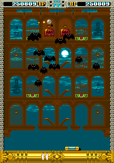 You've also got a few items to help you clear these stages out, both ones you grab with your bat and ones tied to your second button, the magic system. You can make dropped items appear by lighting up all the permanent lights on the board and hitting the egg that appears (more on that later) and these are mostly genre standards like making your ball blast through blocks without bouncing off them, a phantom bat that extends outwards to hit the ball if you're a bit off and a bigger bat, as well as extra magic stocks and a single booby trap that makes your bat smaller- the one disappointment here is there's no lasers or sticky paddle items that you'd expect. The magic is a bit different, as you can activate it whenever you like but while the effect you get seems random at first, it's actually tied to the magic jewel nestled in the middle of the status bar. Each of the four effects- a bird that pesters monsters, a second ball that floats around and damages targets, a flame bar that slowly moves down the screen to keep your ball bouncing off it and a single-shot flame that sets off extra shots to the left and right when it hits something- have their own colour, so wait for the jewel to change to that colour and use it when it'll be the most effective. Like the angle-changing slam, these are pretty well-considered for a game like this, as while the bird is maybe the least useful, the others have specific points you'd want to use them like the flame bar for keeping your ball in the upper section or the shot for sniping particular targets.