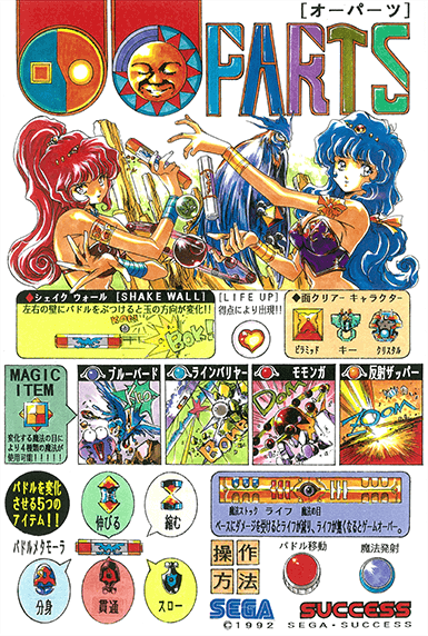 Anyway, OOParts (an abbreviation of out-of-place artifacts, the concept of an artifact found where it shouldn't be, like a Norwegian coin found in Brooklyn, Maine) was in development at Success in 1992 and appears to be basically finished, with the game playable from start to finish with no obvious omissions or missing parts (complete with a credits roll, even). It also got that little bit of coverage in Gamest above, which had a section on the game on page 133 as part of their 1992 AM Show and, ahem, completely misread the title as FARTS. Just a pity they didn't look at the flyer which spells the name out in katakana, eh? They don't say much about it beyond it being a fantasy-themed Breakout-style game with pinball elements, using a spinner and making a joke about the character design being similar to Success' own Cotton games (Hideki Tamura did character design on both games, of course). After that, the game was never released, with Success' own timeline (which is where the image of the flyer above comes from) saying it never made it to production while alluding to the fact that the PCB still exists out there. It was then seemingly forgotten about completely, outside that FARTS gaff, until a certain kerfuffle in the MAME community circa 2018 revolving around SegaSonic Bros. brought OOParts back into the spotlight.