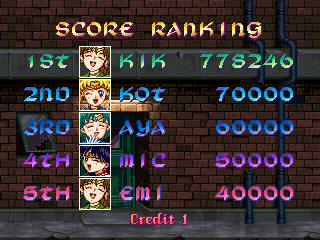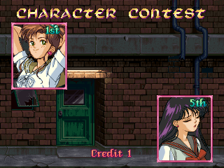 Rather amusingly, after you've finished the game, you're treated to a 'Character Contest' screen- the game keeps track of how often each character is played as, and ranks them in order from most played to least played. Additionally, the character in first place taunts the person in fifth place in Japanese. Since I never got a Game Over any other way (is it because I'm totally hardcore, or because I cheated like a bitch? Who knows?) I can only assume that this also shows up whenever you quit and have to put your name up... I wish this showed up in other beat-em-ups, though (although in fairness, if it was on Final Fight, it'd be useless. Mike Haggar would have 100% of the vote).