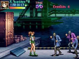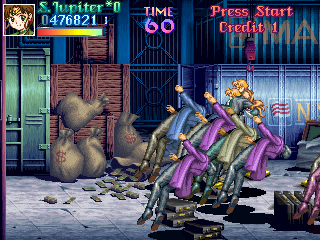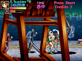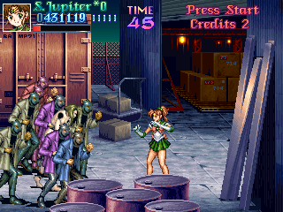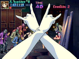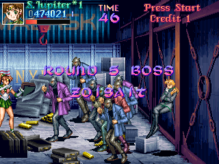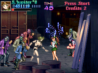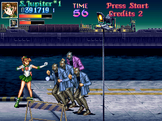 This fight is rather obviously split into two parts; the first will mostly involve Jupiter getting rid of the Goon Legions while constantly being attacked by Zoisait. This is amazingly fun, because it adheres once again to the Final Fight principle; fun is increased in relation to the amount of enemies on screen, and the more overwhelming, the better! Jupiter's able to make very short work of them by abusing her deadly aerial dive, knocking each enemy back into one another...