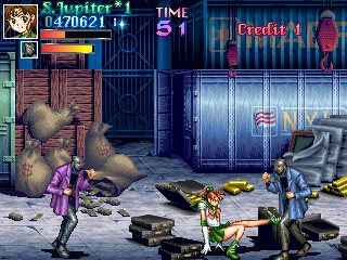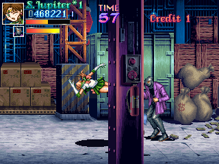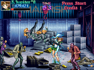 Once the goon ranks have thinned down a little, it's time for the hard part, tackling Zoisait alone. This guy is an incredibly annoying boss, as he seems to take delight in zipping around the room, attacking you with electricity, and generally being a total dick. What makes this fight even more irritating is the fact that, as well as floating, Zoisait leaves shadow trails, similar to using a Super Move in the Street Fighter Alpha games, which is pretty confusing and goes to show this guy is just a show-off; the worst kind of boss in any beat-em-up (see also: Rolento from Final Fight). Jupiter shows no mercy, but...