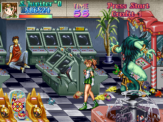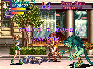 The sight of a perfectly innocent arcade being violated and torn asunder by this once peaceful kitteh offends me to the very core, but I'm going to note that this is Interesting Idea #2, and unlike the first one, I can't think of another scrolling beat-em-up where the idea's been used. Rather than fighting the boss at the end of the stage, you fight it throughout the stage, and when its health gets down to a certain level, it runs away and you have to catch up with it. Admittedly, the stage isn't terribly long, so the boss only runs away twice before you finish it off, but it's a pretty cool idea.
