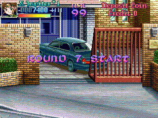 Back on the streets, we come to find that we're in awfully familiar territory. That's right, Round 7 is, in fact, a palette swap of Round 2, with extra interludes in the arcade and the grocery store, which is coming up next. Palette-swapped enemies I can understand, but a palette-swapped stage is a first for me. In fairness, though, Round 7 does take you inside a few buildings that you didn't get to visit the first time 'round, and it has such a different idea behind it that I'll let it get away with it. This time. Besides, it's relatively clever, as it's the same stage but at a different time in the day. So, for once, I'll be merciful...