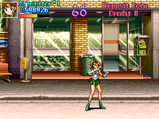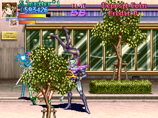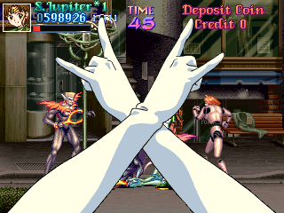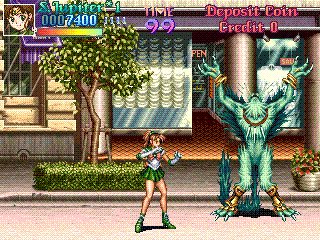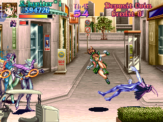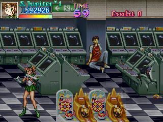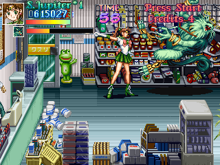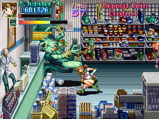 The desperate struggle continues in the grocery store, and... It's exactly the same as the first encounter. Kitty-Cat only has the one slashing attack like he did in the arcade, although this time, the creepy marionettes appear from absolutely nowhere and decide to help the monstrosity out. Aside from that, we've been here before. No new moves, no new nothin'. Once Jupiter's wailed on him for a while, she gets the beast's health down to the halfway mark, and...