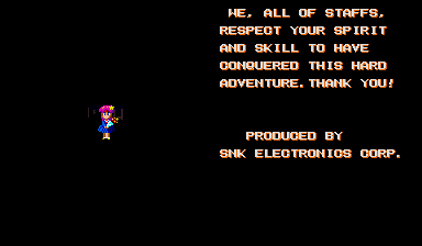 Ahem. Anyway, the ending text is, of course, in SNK's standard English. Less hot dog references than their Neo Geo translations, but good enough.