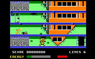 Next, we have the respectable Commodore 64 version, which still can't pull off an amazing conversion, but does the job well enough. It's a smidgen faster than the Speccy version, and there's obviously more colour, even if Athena has apparently turned blonde and it all looks a bit washed-out. This one keeps the four tiers from the arcade game, and it's also the only home version that lets you control the spaceship after you die. There's not much else to say, really- it's alright. Not particularly painful to play, nor is it a fantastic conversion.