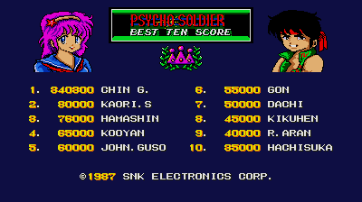 Unsurprisingly, not as many people seem to like Psycho Soldier as much as I do. I've seen complaints on other websites about the length of the levels and the difficulty, but these stages flit by- the game takes roughly 30 minutes to beat, so that's about 5 minutes per stage. There's a few sections that drag out (Stage 4 does go on for a little longer than is strictly necessary, as does Stage 6) but if you're playing well (especially if you're going for a one-credit run) then the stages are an acceptable length. As for the game's difficulty, honestly it peaks on Stage 3, then dips again, and only really reaches SNK levels of difficulty again in time for Stage 6, which is bordering on a little unfair. The bosses usually have an exploitable pattern that's very easily learnt (and with the exception of the final boss, go down quite quickly) and while the screen can get incredibly crowded at times, it's not that hard. This is SNK operating at a Top Hunter level of hard rather than, say, Art of Fighting 2 or The Super Spy. If you stop playing like a jackass and learn how this shit works then it becomes a pretty good game... But not a five-star one. Why? Because it's based on so heavily on SonSon in the first place- it makes tons of improvements, yes, but you can only improve SonSon so much. It's limited by its heritage, is the thing, but don't let that stop you from playing it!