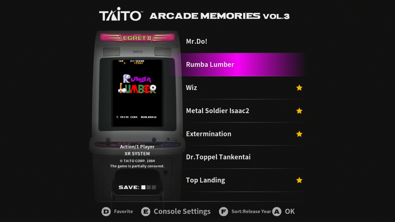 Rumba Lumber was one of the 10 titles included in the Arcade Memories Vol. 3 expansion pack released in December 2024 for the Taito Egret II Mini plug-and-play console, originally released all the way back in 2022. It's pretty much a direct emulation with only two things to really note- first, the language option is not present so the attract mode and Training Stage instructions are in Japanese, and the menu notes that 'this game is partially censored', by which they mean the insert coin noise has changed from the Godzilla roar to a less infringing creature noise. This is your only option for now, but on the bright side, you get Top Landing and Wiz to play with it as well, probably better options!