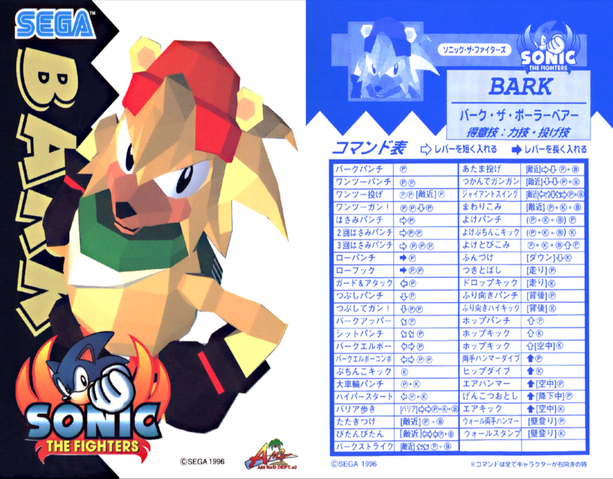 | ![]() THE POLERBEAR From: Sonic the Fighters (1996) Full Name: Bark the Polarbear Speciality: Throw Home Stage: Aurora Icefield beanie and scarf, he's ready to take everyone else for a ride with his throws. |
