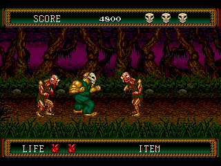 The island itself is one of the weirder segments of the game. First, the primary enemies are Ghouls, which are sorta-like zombies (in that, well, they're dead and rotting) but unlike the very punchable and delicate Deadmen, they have a tendency to get back up- punch them once and they'll go back into the ground, then their spirit rises to resurrect from the ground shortly afterwards. They'll eventually disappear permanently, but you should just keep marching on here, as the other enemy is a bit more annoying. The Spirit (these ones have faces, aahhhh) floats above the ground, take a few punches to knock out, and if they touch Rick, they'll encircle him and reverse your controls. Left is right, right is left. Fun, especially since this area's dotted with Ghouls and pits. My advice? Try and avoid the Spirits, but if one grabs you, march on and keep picking up Spirits so your controls don't suddenly revert to normal. This is especially amusing as gathering enough Spirits will cause some slowdown, if you want to flummox your poor little Mega Drive.