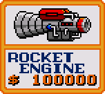 ![]() Jet Engine Initial Cost - $5000 No Price Increase Faster than the Big Wings, the Jet Engine is perfect for scooping up coins after killing a boss, but might be a touch fast for some. Practice with it first to see if it's for you. ![]() Rocket Engine Initial Cost - $100000 No Price Increase The fastest speed upgrade in the game, the Rocket Engine is a stupid, stupid waste of money, and makes Opa-Opa nearly uncontrollable. If you buy it, you are clinically insane. |