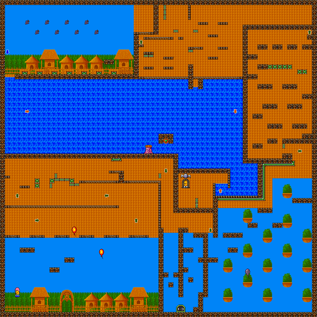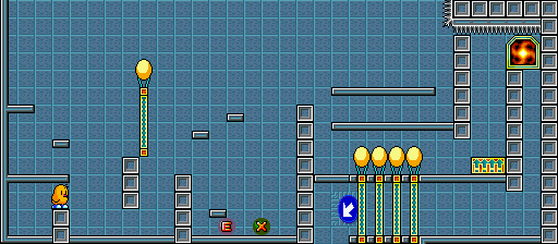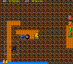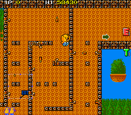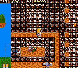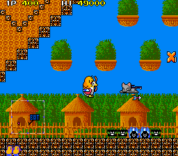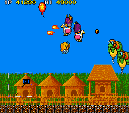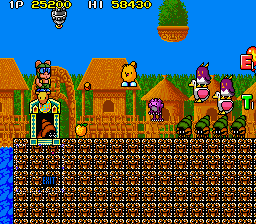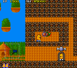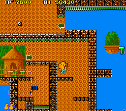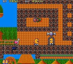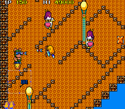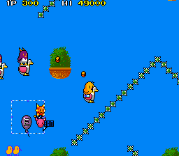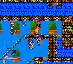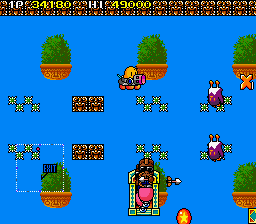 A lot of important enemies make their first appearance here, chief among them being the spikey orange menace Frankie. You may have seen them briefly at the end of 1-4 if you dilly-dallied before the boss room, but this time they're out in force If it's not obvious from the thorns all over them, Frankies are one of the few enemies that can kill Tiki just be touching him, and while they don't exhibit this behaviour in this stage, they can duplicate themselves and very quickly fill a platform. They're also faster than most other enemies and will try to pursue you when they can, so don't hesitate, take them out! There's also Mr. Wakelin, who'll run around and make random enemies spawn at a frightening rate, to the point where enemies won't even spawn from doors if he's allowed to run amok. He doesn't have a vehicle to call his own just yet, but give it time. The last of the critical enemies is easily missable, but the Astronaut appears here for the first time, with its amazing UFO vehicle and deadly laser- they luckily telegraph well in advance before they fire. Finally, there's a few less important enemies- the Pumpko uses a Hot-Air Balloon and drops bombs from above, usually trying to stay above you, while the Winged Cat is mostly harmless except when scratching in the air, at which point it'll kill you. Quite a few newcomers, then!