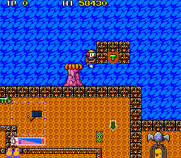 This is a bit more like it, we've got a genuine maze on our hands! The general path through the level is fairly rote until the maze, with the main theme being forcing you to dump your vehicle whenever you move between areas. There's a low spike ceiling between the first open area and the maze of platforms upwards, for instance, forcing you to jump from tiny block to tiny block while dodging Winged Cats and Grim Bats (unless you take a Duck, which can just about fit underneath). Once you reach the pool of water at the top of the round, you need to wait for a few Penguins to spawn- aim your water shot well and steal the Duck, then enter the spike maze! All sorts of enemies will be in the maze to make things difficult for you, but at least the game helpfully signposts the way- if you reach a dead end, there's s STOP sign to let you know. You're aiming for the bottom-right corner, just don't hit those spikes, it'll be difficult to recover from it. The final segment isn't too bad, but you'll want to avoid that bundle of fruit- the Sea Claw will get you if you're greedy!